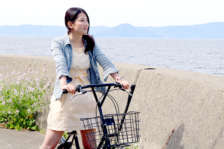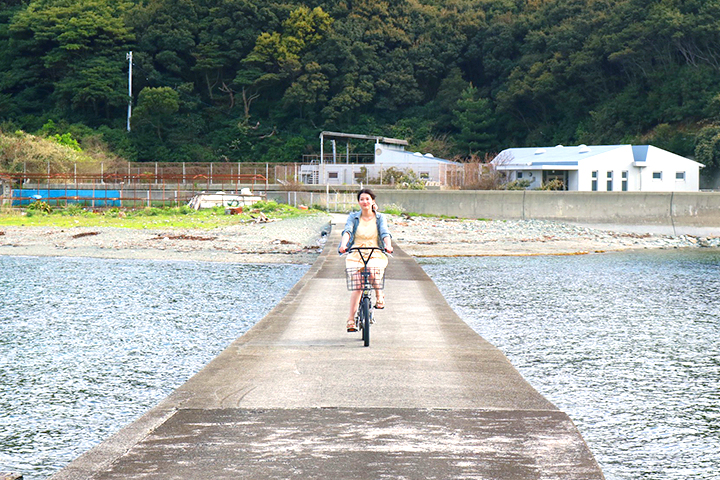 龍王神社まで続く一本道。風を浴びて左に大島を眺めながら走るサイクリングはとっても気持ちいい!